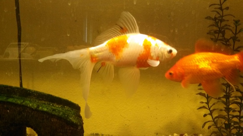 Front and center, Speckles. To the right, Loam. Loam started out charcoal black, but turned orange as he grew up, which is apparently common for darkly colored goldfish.